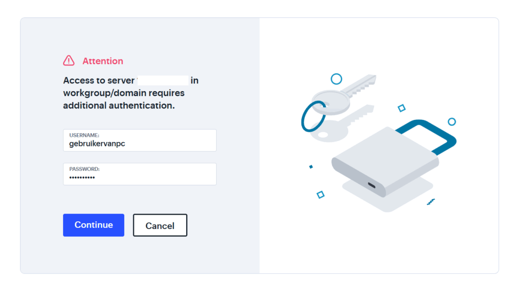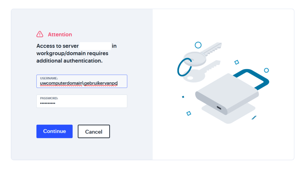 Maakt uw netwerk gebruik van een domaincontroller dan dient u ook het domain op te geven bij het inloggen. Uw systeembeheerder kan hierbij assisteren, om de juiste gegevens te achterhalen: